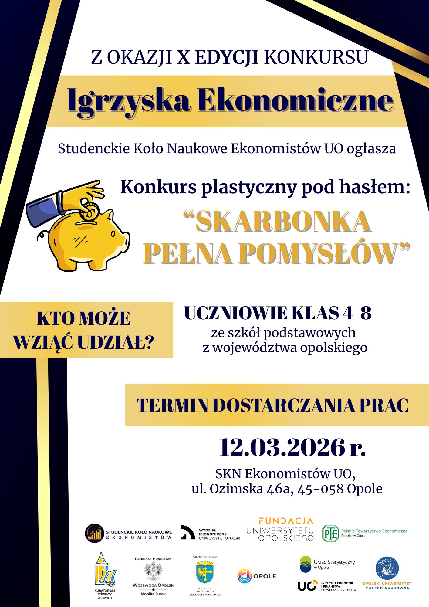 Studenckie Koło Naukowe Ekonomistów Uniwersytetu Opolskiego wraz z Wydziałem Ekonomicznym Uniwersytetu Opolskiego, Polskim Towarzystwem Ekonomicznym o. Opole oraz Fundacją Uniwersytetu Opolskiego mają zaszczyt zaprosić Uczniów szkół podstawowych z województwa opolskiego do udziału w I edycji Konkursu plastycznego pod hasłem „Skarbonka pełna pomysłów”.