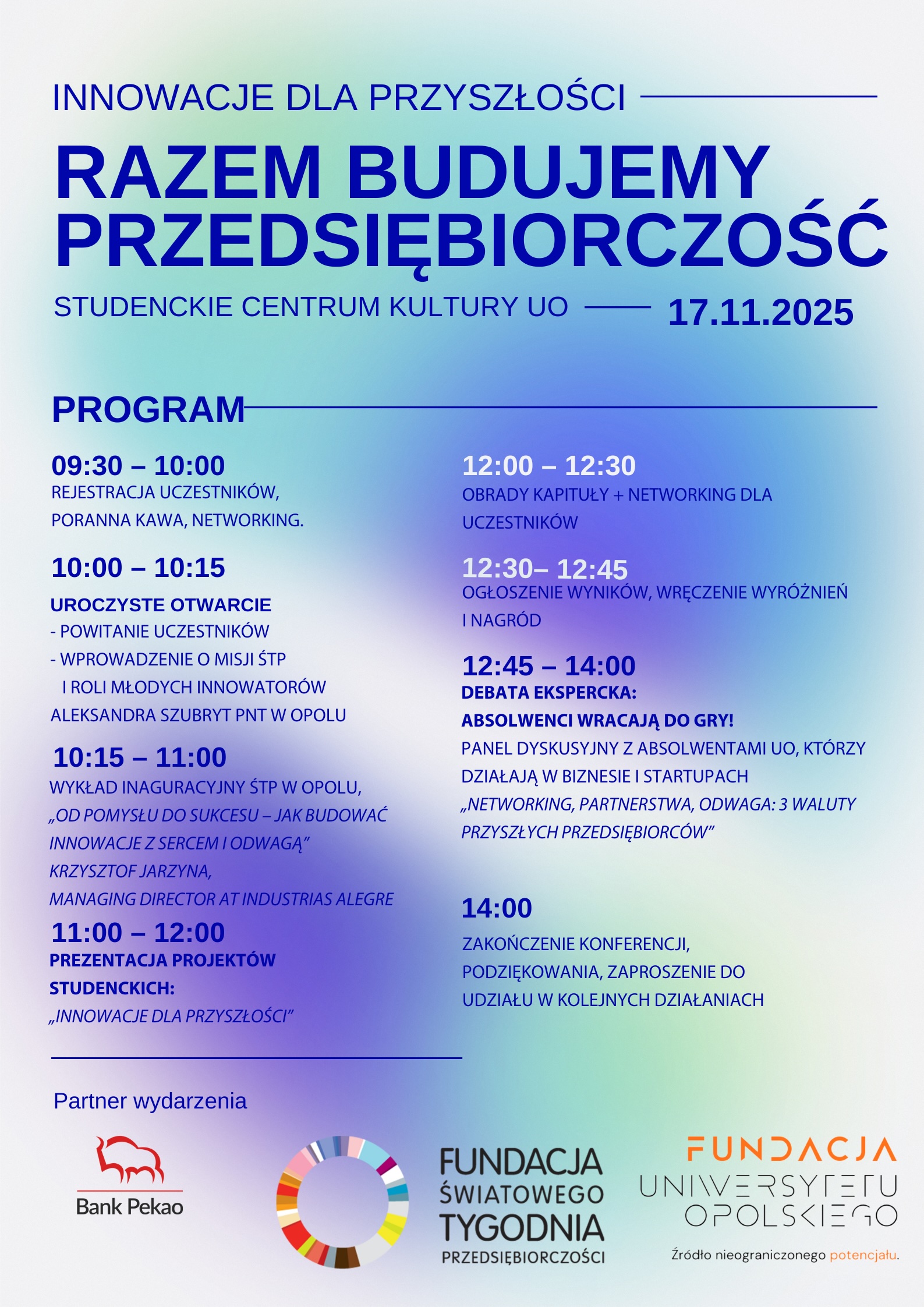 w imieniu organizatorów serdecznie zapraszamy Państwa oraz studentów do udziału w wydarzeniu „Razem budujemy przedsiębiorczość!”, które odbędzie się 17 listopada 2025 r. w Studenckim Centrum Kultury Uniwersytetu Opolskiego w ramach Światowego Tygodnia Przedsiębiorczości.
