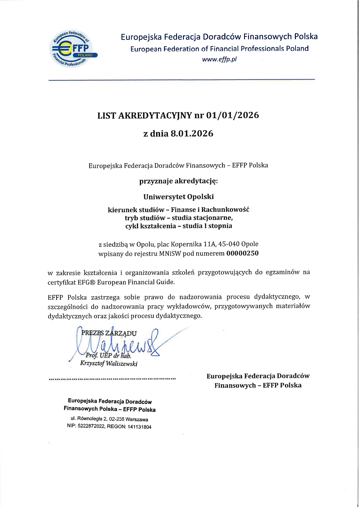 Uniwersytet Opolski w dniu 8 stycznia 2026 r. zawarł umowę z Europejską Federacją Doradców Finansowych (EFFP Polska), dzięki której studenci Wydziału Ekonomicznego kierunku Finanse i rachunkowość I stopnia będą mogli przystąpić do egzaminów uprawniających do uzyskania certyfikatu Europejskiego Asystenta Finansowego EFG® (European Financial Guide).